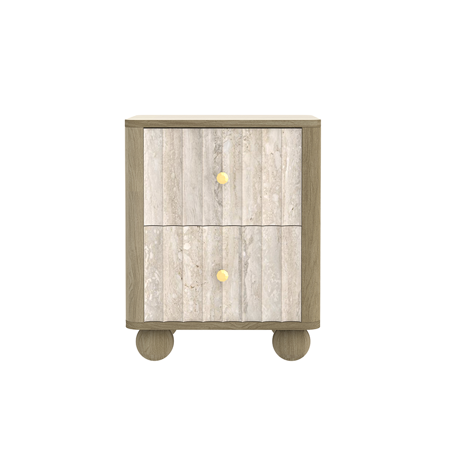Travertine-tone fronts meet rounded ball feet and warm brass knobs, bringing a soft, mineral calm to the bedroom.