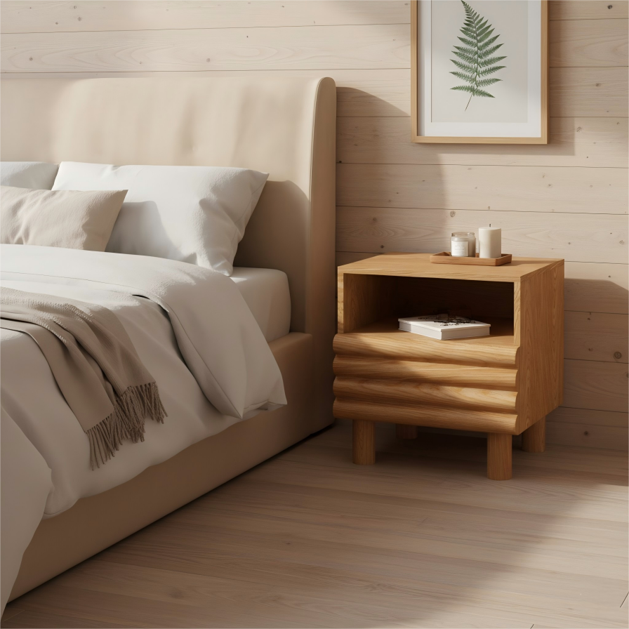 A2. One or two drawers plus a small surface are usually enough for nightly essentials. Open shelves are helpful for books, tissues, or baskets.