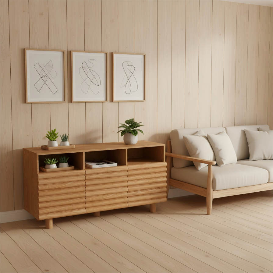 Warm-oak sideboard with three open cubbies and sculpted ripple doors; clean lines, round legs.