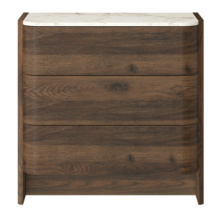 A 3-drawer chest (80×40×79 cm) that sets a marble-look slab over a dark-walnut body with softly curved, handle-less fronts. The continuous radius corners and clean plinth create a quiet, hotel-suite presence while the compact depth keeps rooms feeling open.