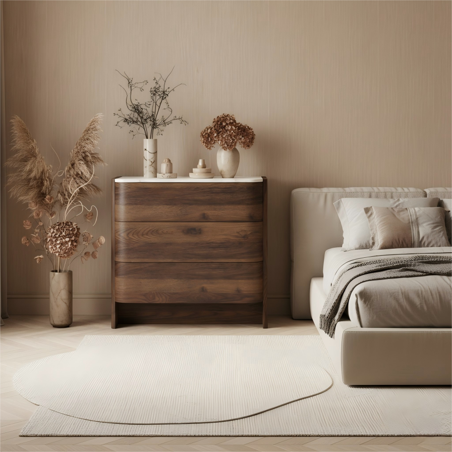 The Next Bestseller:Stone + walnut contrast reads premium in thumbnails and lifestyle shots.Curved, handle-less fronts feel tactile and upscale; no visual noise.79-cm height works for bedrooms, entry catch-alls or living storage.OEM/ODM finishes; RTA/ISTA-3A mail-order ready.