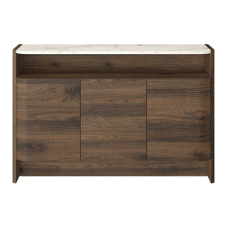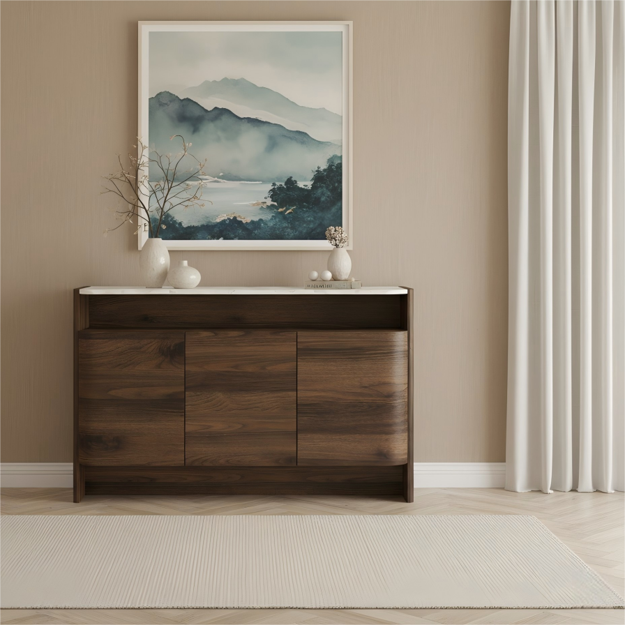 A 120×40×79 cm sideboard that pairs a floating marble-look slab with a dark-walnut body and softly radiused ends. The open gallery shelf under the top invites styling or barware, while clean, handle-less fronts keep the silhouette tailored—capturing 2025’s quiet-luxury mix of stone + dark wood and rounded edges.
