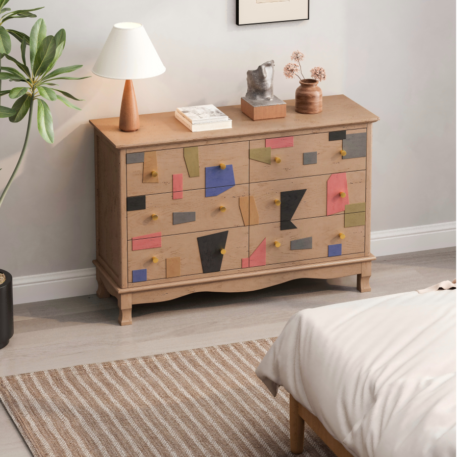 A playful color-block marquetry front meets a refined cottage base. The irregular geometric appliqués bring gallery-style energy, while the warm, lightly distressed oak finish and brass knobs keep it timeless. Clean lines + artisanal texture = a dresser that feels curated, not noisy.