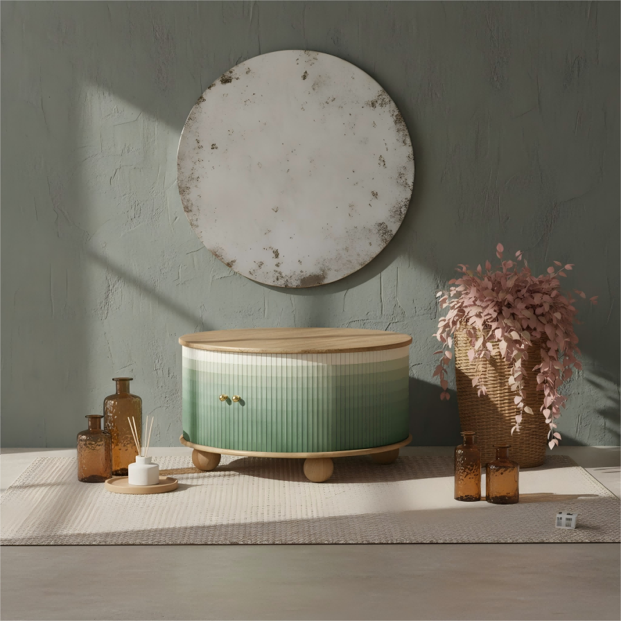 A round tambour cabinet with a calm green ombré wrap, soft oak-look top and base, and playful ball feet. Curved slats glide open for 360°-friendly access while fully rounded edges make it living-room and family safe.