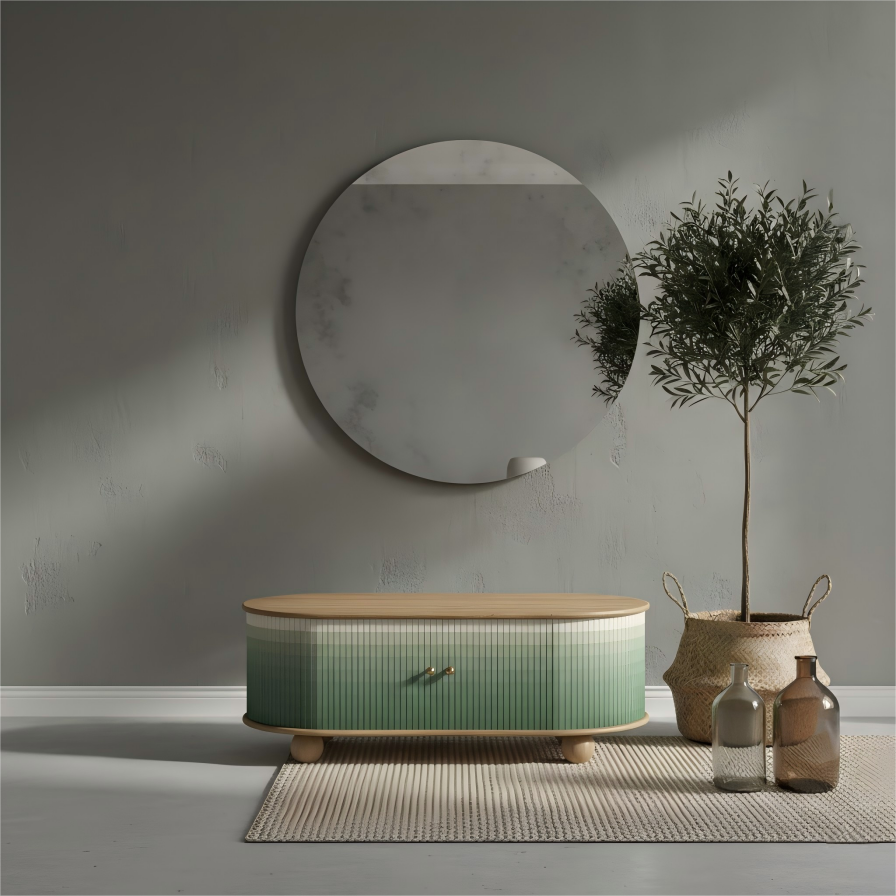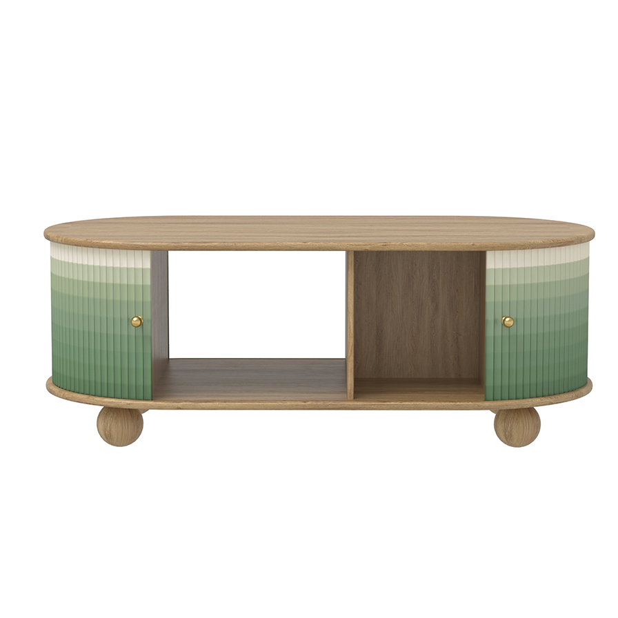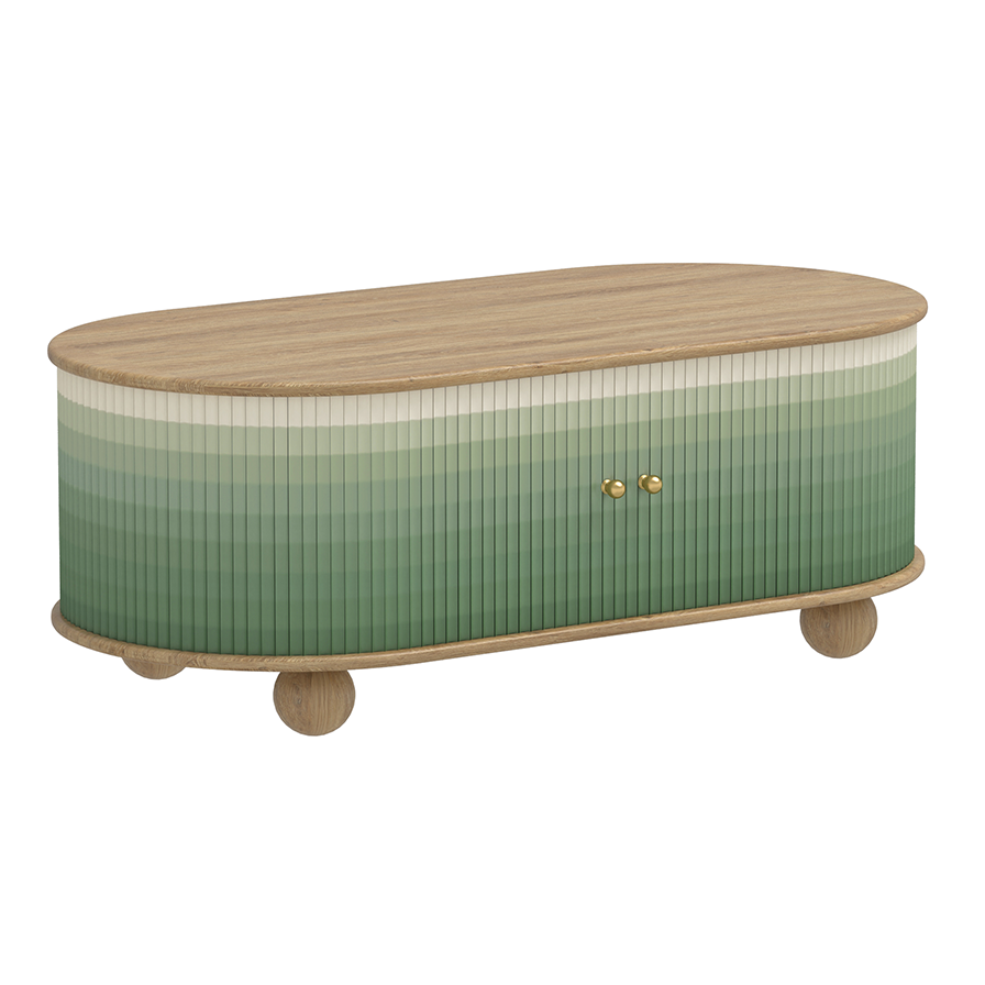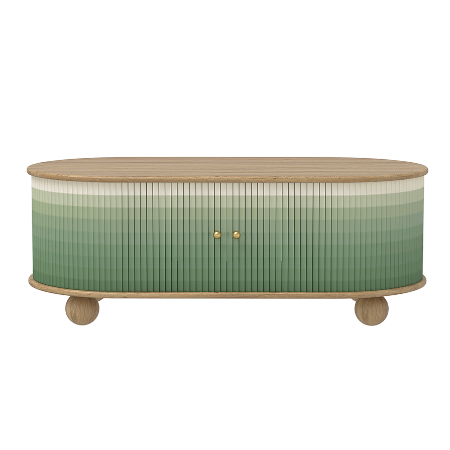 An oval tambour cabinet wrapped in a serene green ombre, softened by fully rounded edges and a warm oak-look top and base. The sliding tambour doors keep the profile clean while offering quick, quiet access to generous interior storage. Ball feet lift the piece visually and invite pairing with sofas, beds, or entry walls.