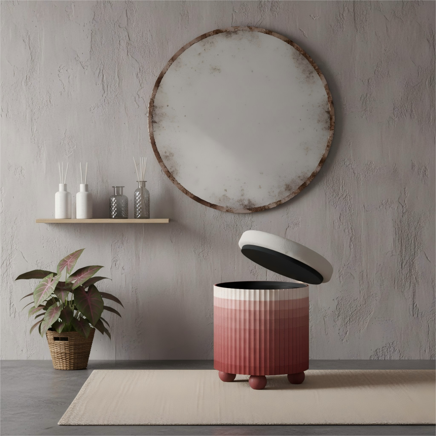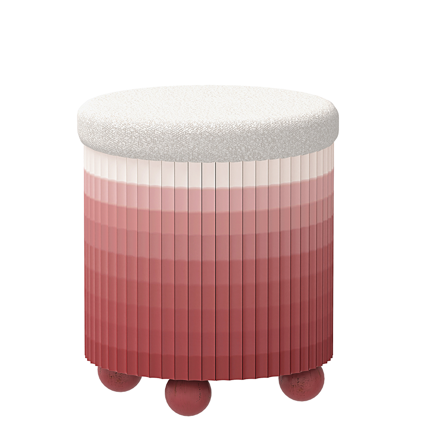A compact drum ottoman with a lift-top lid and hidden storage. The softly rounded bouclé seat sits over a playful ombre fluted skirt in blush tones, finished with ball feet for a light, modern stance. Petite at 45 cm, it doubles as a footrest, bedside perch, or entry catch-all—safe edges, small footprint, big personality.