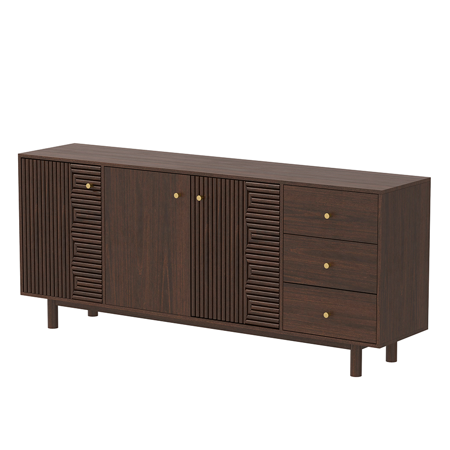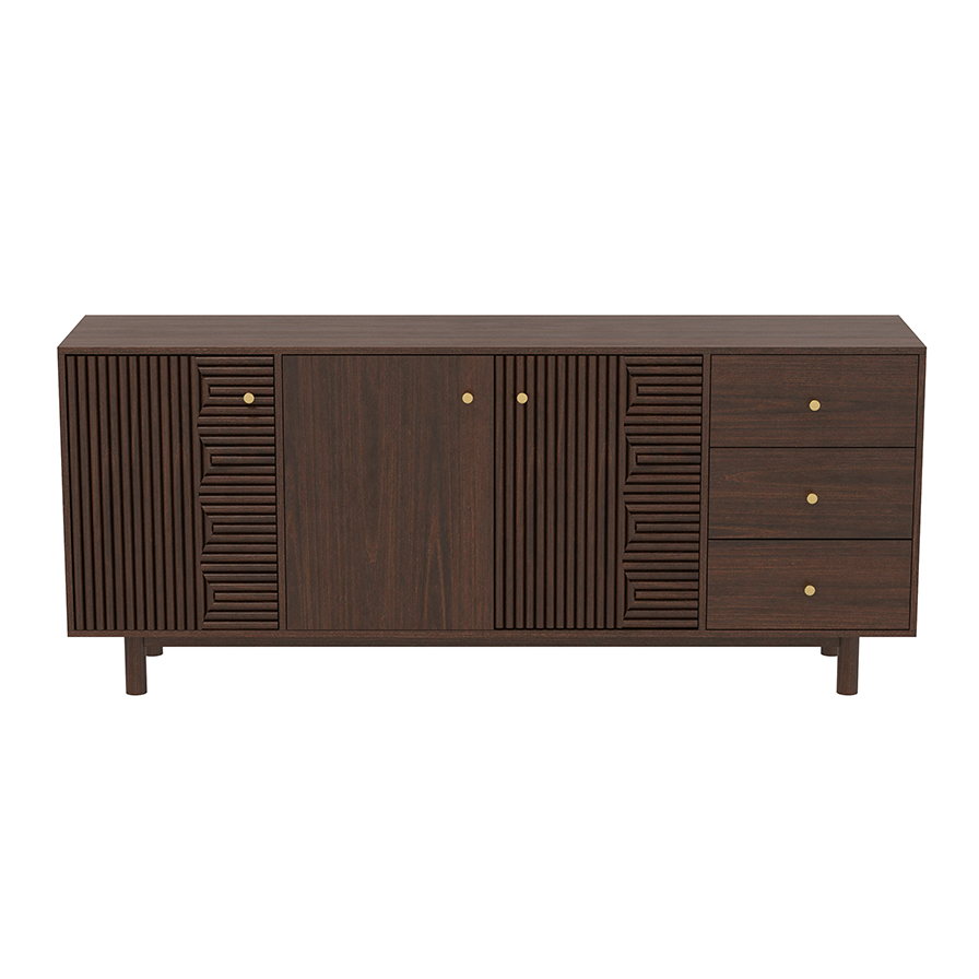 ODM/OEM ServiceThis dark-wood slatted series is available under our ODM/OEM program. All pieces—sideboards, TV units, cabinets and chests with graphic fluted fronts and slim round legs—can be tailored in size, storage layout, slat pattern, veneer / foil décor, knob finish and hardware to meet different market and packaging requirements.