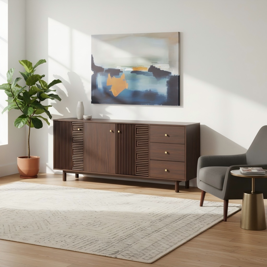 A5. Contemporary interiors often use sideboards with clean lines, fluted fronts, or mixed materials such as wood and metal. Neutral colors make the piece easy to pair with different decor.